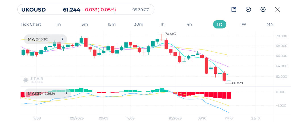 10月初旬以降、ブレント原油は70ドル→60ドル台へと急落。