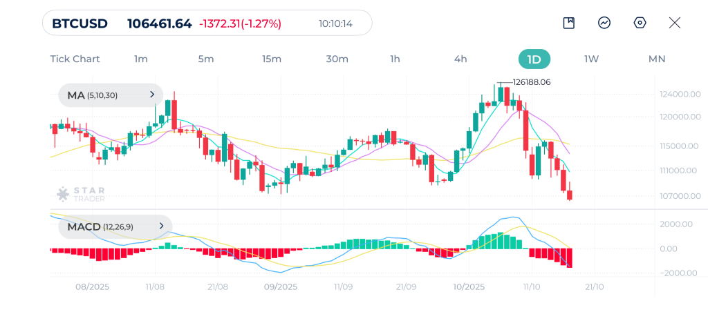 ビットコインは主要高値から明確な反転下落を示しており、日足では大きな陰線が続く。