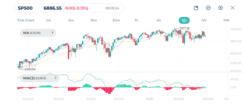 S&P500は直近のもみ合い局面を経ても、主要な上昇トレンドを維持しています。現在はおおよそ6,800〜7,000のレンジ内で横ばい推移となっています。