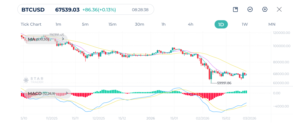 ビットコインは、長期的には上昇構造を維持しているものの、現在は調整局面にあります。直近では60,000ドル付近で反発し、67,000〜68,000ドル台まで回復しました。